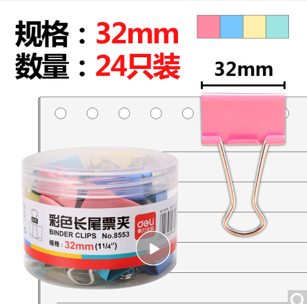 • 商品名稱:得力(deli)24只32mm彩色長尾票夾 金屬票據夾燕尾夾鐵夾子 中號8553